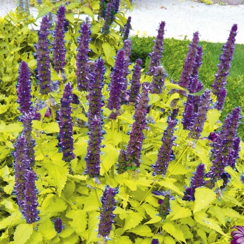 Golden Jubilee Agastache produces chartreuse colored foliage with minted scent when crushed or cut. The big purple blooms adorn the plant from summer into fall. great for cut flowers and irresistible to butterflies, bees, and hummingbirds. This tough resilient plant performs well even in high heat and humidity.