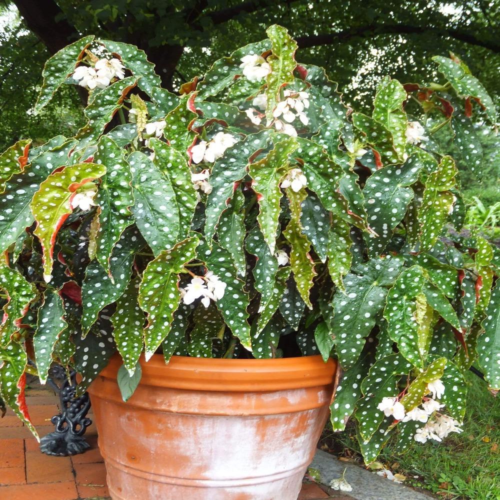 Begonia wightii Maculata goes by the nickname "Polka Dot Begonia." the large leaves have dramatic silver spots and the plant produces white flowers. This stunning Angel Wing Begonia can be grown in hanging baskets or pots and is a vigorous grower.