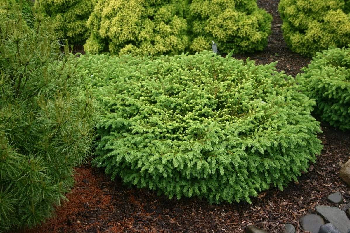 Birds Nest Spruce Shrubs are a true dwarf evergreen shrub that makes an excellent choice for an evergreen border, accent or container plant. The outward-curving branches are covered with dense, dark green needles that create an interesting bird's nest effect. It's tight, compact shape requires little maintenance.