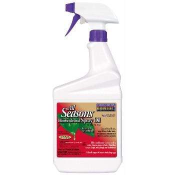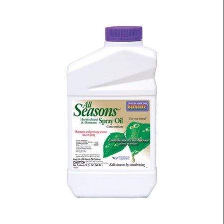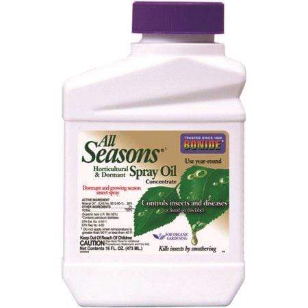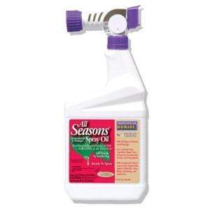 A superior type paraffinic oil, Bonide All Seasons Spray Oil degrades rapidly and has almost no toxicity. Highly recommended for use on fruit trees, shade trees, shrubs, ornamentals, roses, and vegetables. Includes a spreader/ sticker.