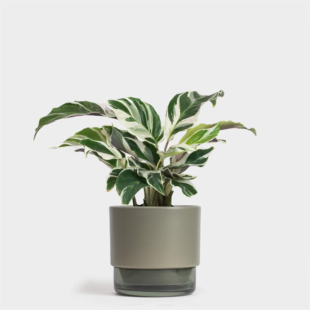 Calathea White Fusion (Calathea hybrid), also known as White Fusion Peacock Plant or Zebra Plant, is a tropical plant known for its darkly patterned leaves with light green, white, and lilac stripes. The unique, gracefully arching foliage resembles a delicate and elegant peacock tail. It is a part of the Marantaceae family, and likes bright, indirect light at most, as the colors will fade and the leaves will burn if exposed to too much direct light. These plants like to dry out some between watering.  Beloved by interior designers and decorators, Calathea house plants bring personality and color to any space indoors.